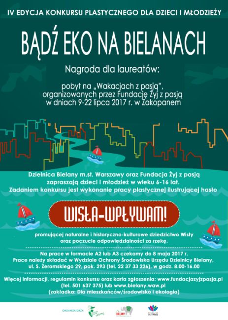 Dzielnica Bielany m.st. Warszawy oraz Fundacja Żyj z pasją zapraszają dzieci i młodzież z Bielan, w wieku 6-16 lat, do wzięcia udziału w czwartej edycji konkursu plastycznego „Bądź EKO na Bielanach” pod hasłem „Wisła-wpływam!”. Na prace czekamy do 8 maja 2017 r.