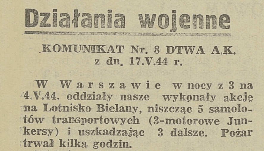 W Warszawie w nocy z 3 na 4.V.44 oddziały nasze wykonały akcję na Lotnisko Bielany, niszcząc 5 samolotów transportowych (3-motorowe Junkersy) i uszkadzając 3 dalsze. Pożar trwał kilka godzin.