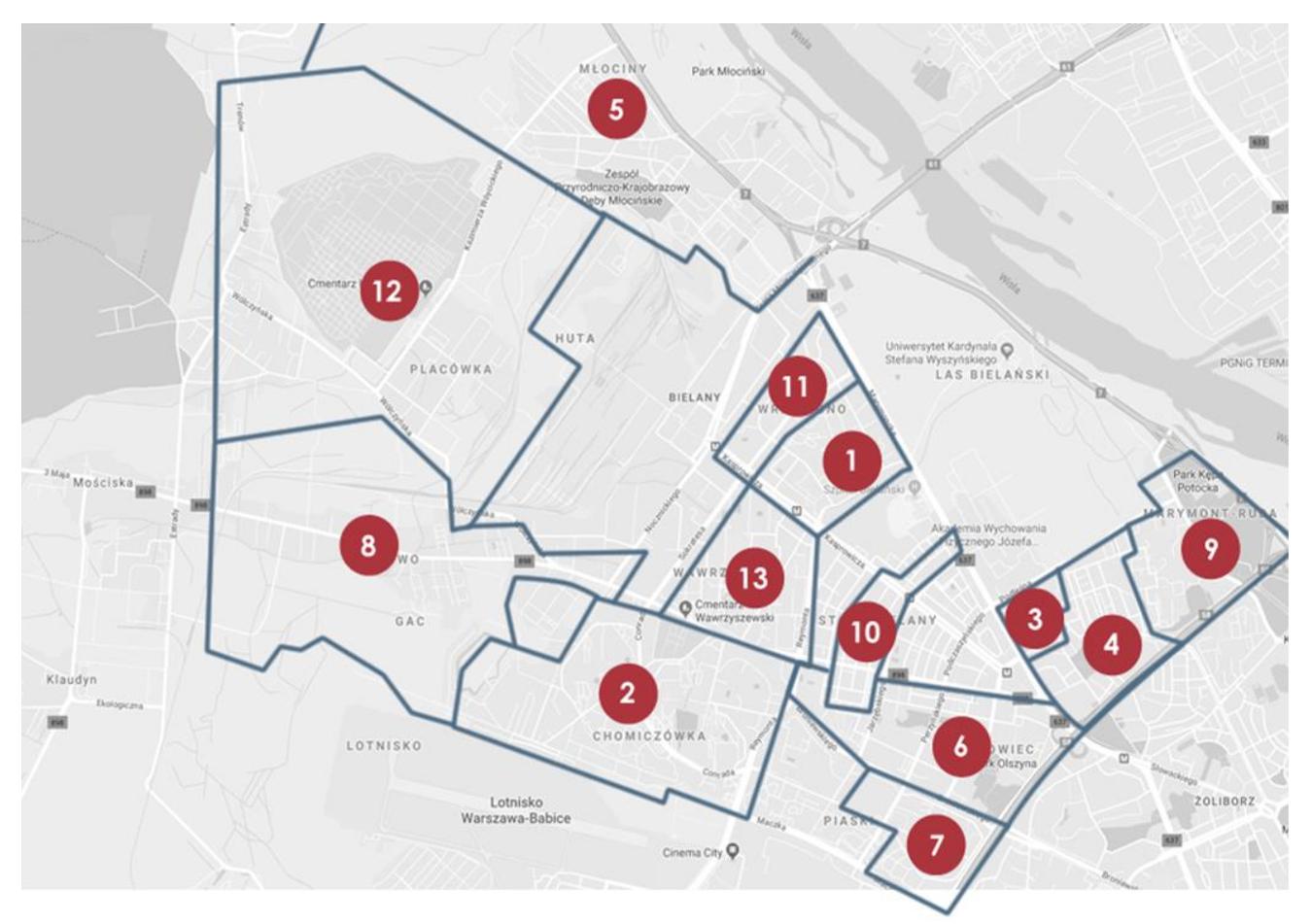 Grupy Osiedlowe działające w ramach projektu „Bezpieczna dzielnica” obejmują swoim działaniem następujące osiedla (Samorządy Mieszkańców):